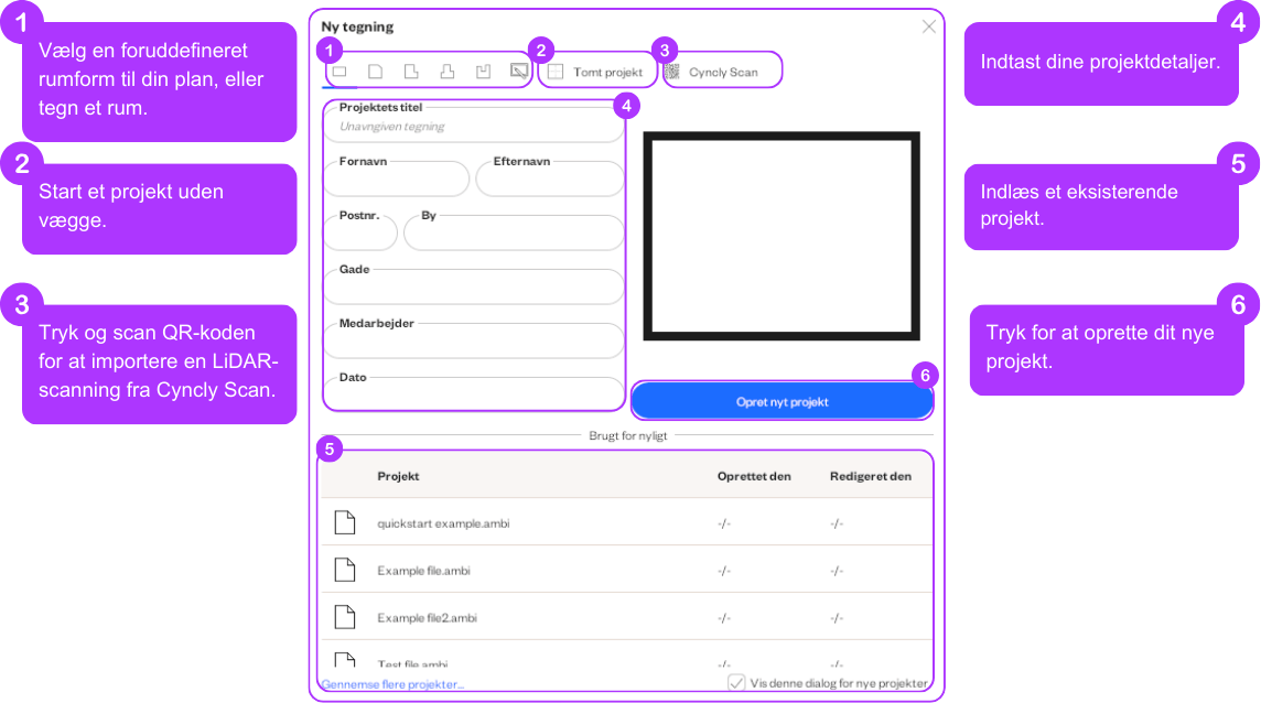 I SimpliPlan kan du ved åbning af programmet eller oprettelse af en ny plan bruge Quick start assistant til at åbne en gemt plan, oprette et tomt projekt, tegne et rum, vælge et foruddefineret rum eller åbne en af dine seneste planer.