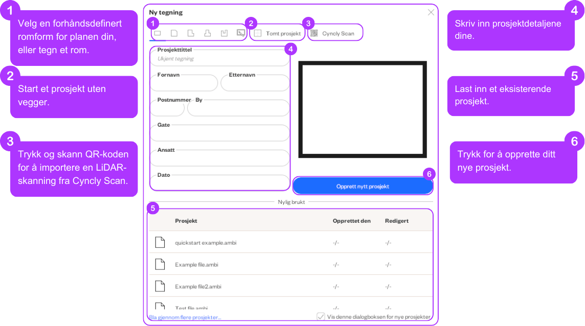 | Merk: Du kan trykke på Utforsk flere prosjekter for å se alle lagrede prosjekter. Du kan også fjerne haken for Vis denne dialogen for nye prosjekter for å deaktivere Hurtigstartassistenten, som kan aktiveres igjen i Generelle innstillinger. For mer informasjon, se Generelle innstillinger. |